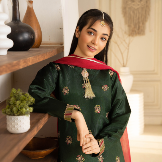 Embrace your day by wearing this embroidered three-piece sharara set from Daisy Outfit. Product Detail: Shirt Embellished Embroidered Shirt with Round Neckline, Embellished Sleeves Fabric: Kattan...