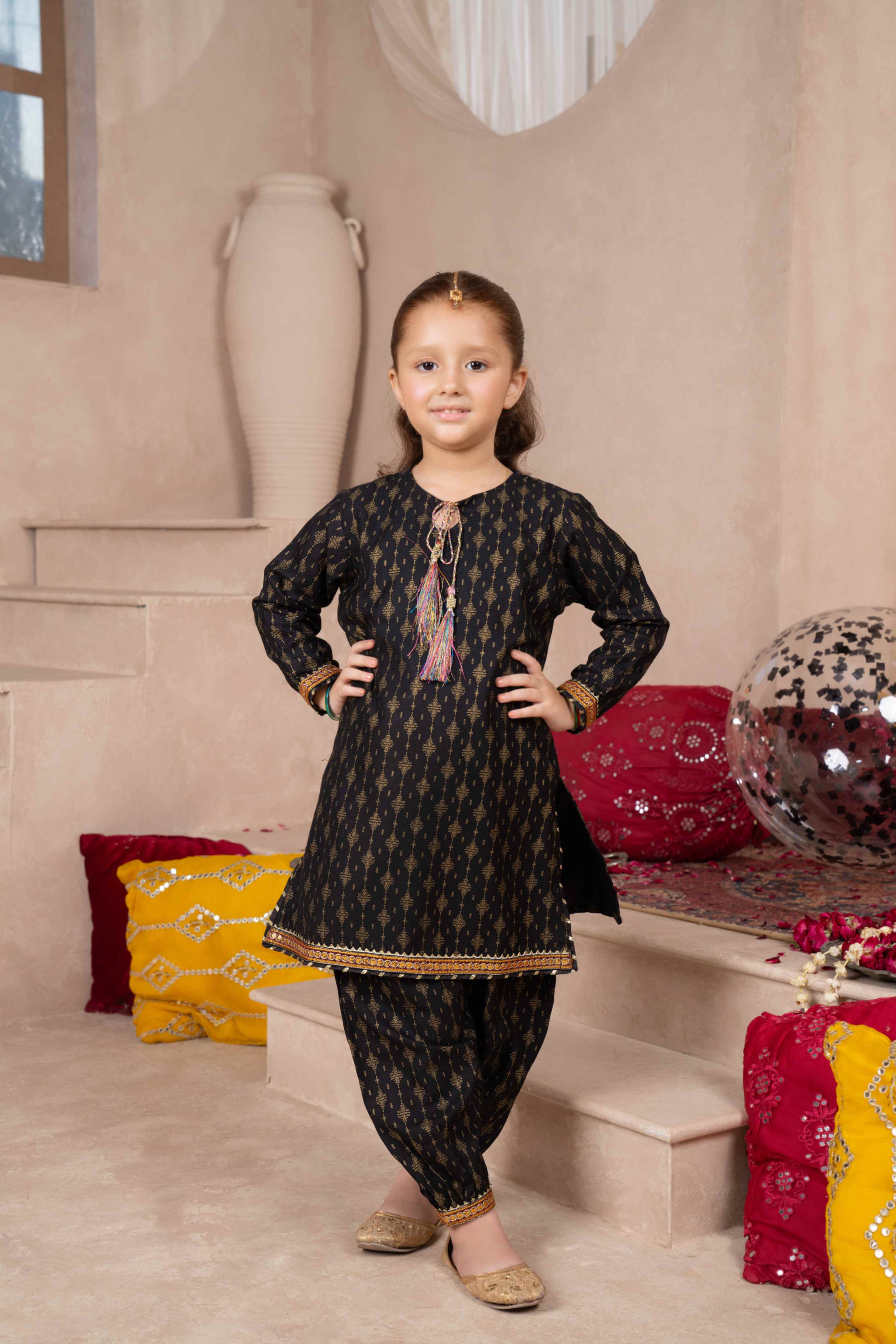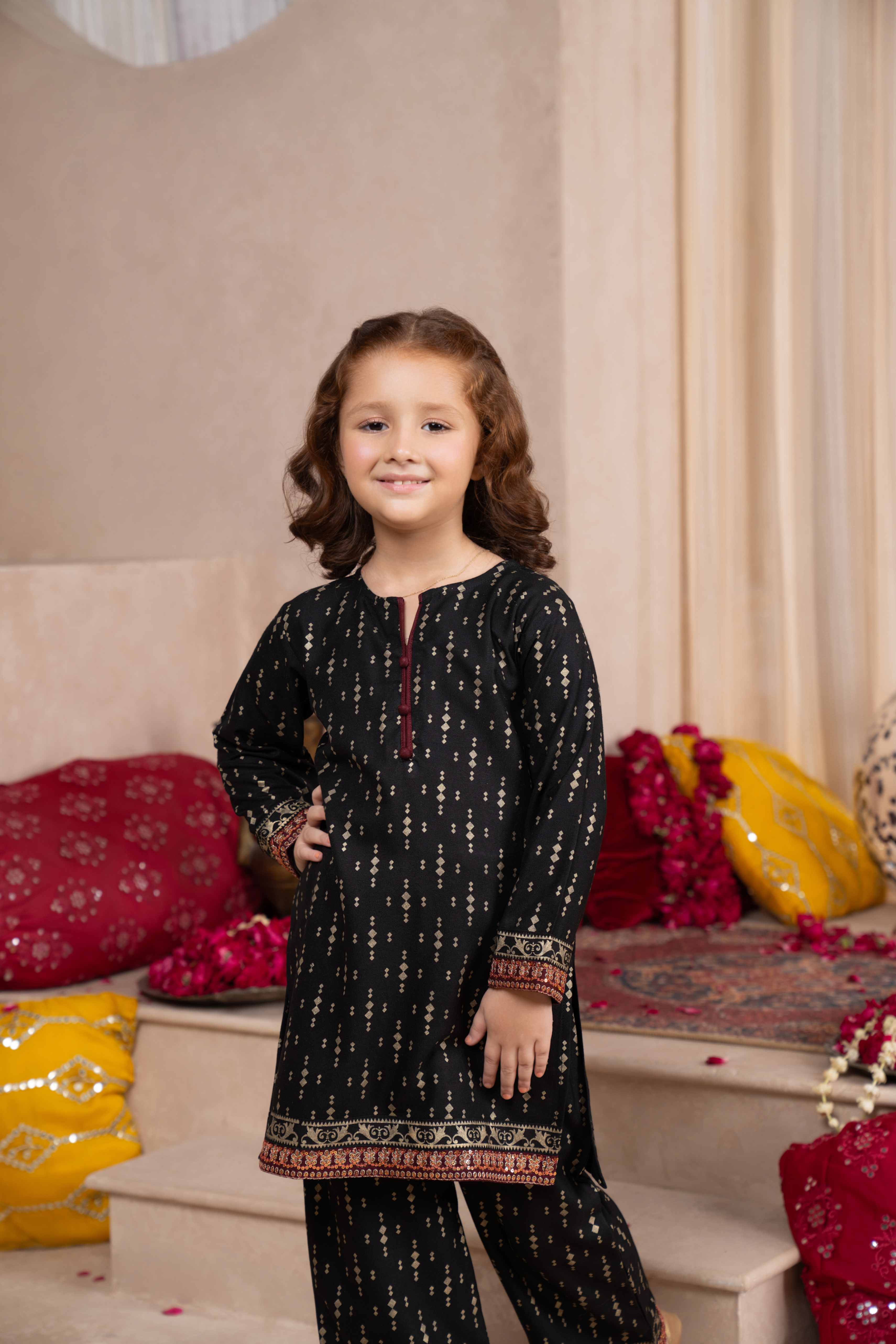 Doll up your little girls this winter season by wearing this sequin embroidered & hand paste printed two-piece suit from Daisy Outfit. Product Detail: Shirt V...